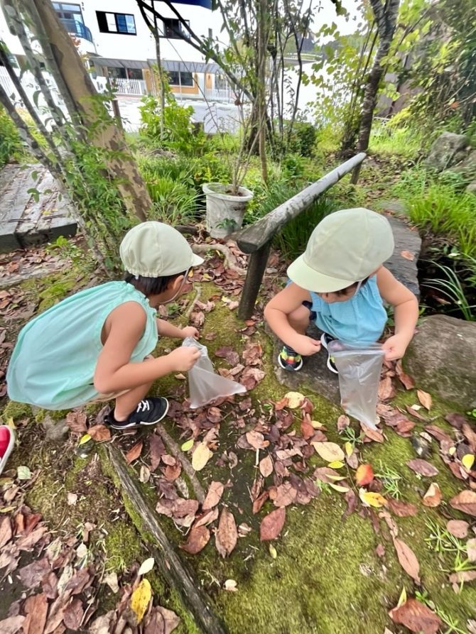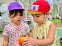 秋を楽しんでいます♩ 2025/11/10 おしらせ ビオトープにはたくさんのどんぐりが落ちていてどんぐり探しに夢中です。身近な秋を感じながら楽しんでいます🍁 みどりの泉に実っていた柿を収穫して食べました。とっても甘くてどんどん手が伸びていました。